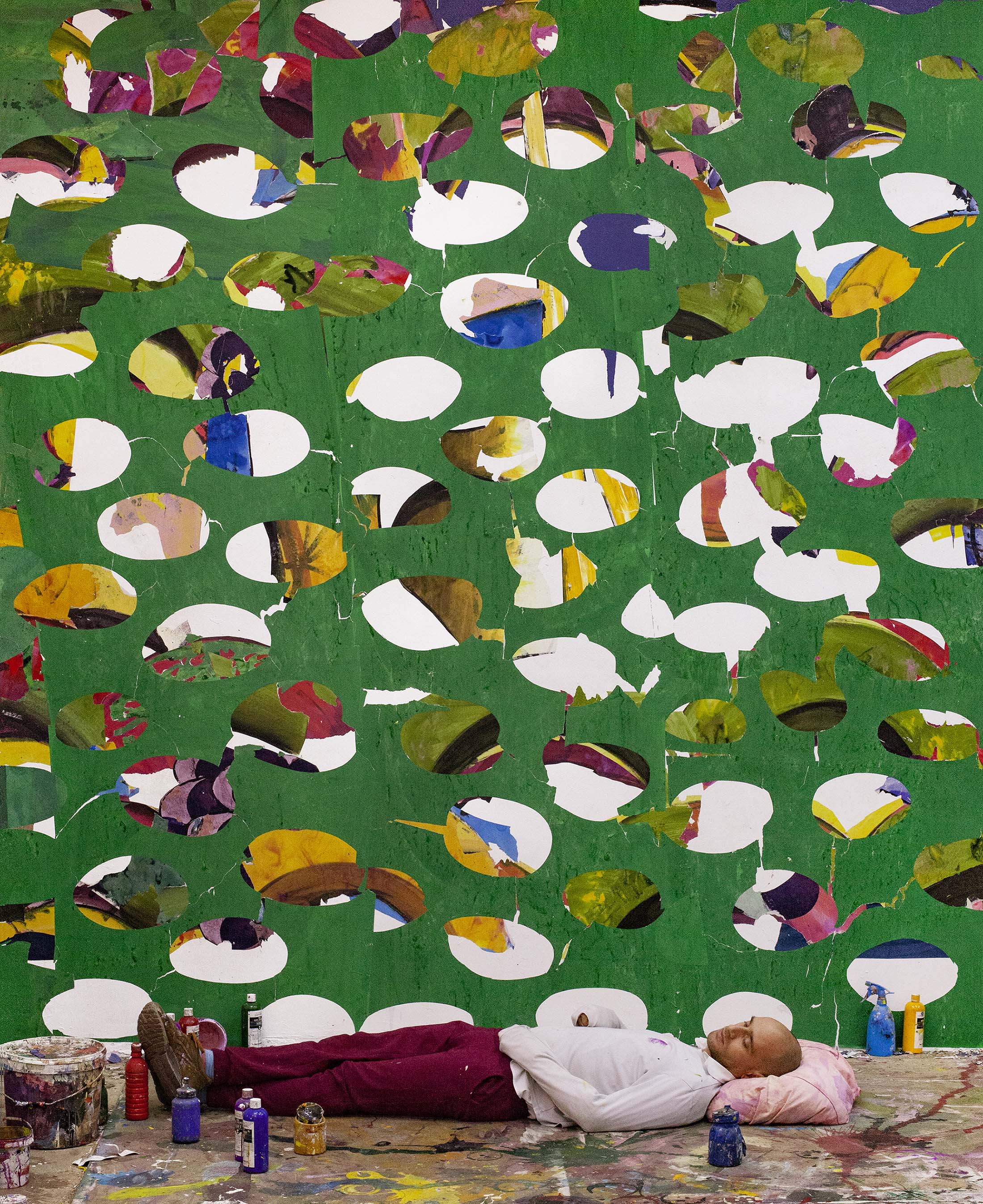 Studio Tryouts | crayon, oil on canvas 200x230cm wall installation: gouache on paper